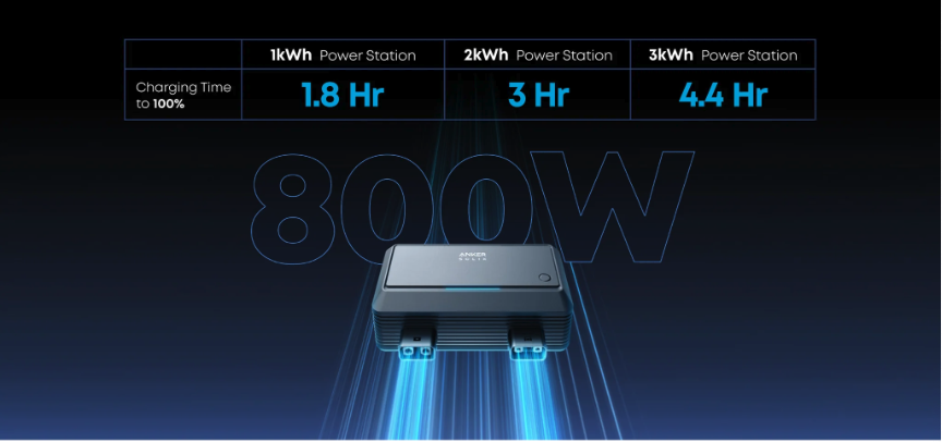 最大800Wで充電した場合、容量1000Wh充電するのに、わずか1.8時間。