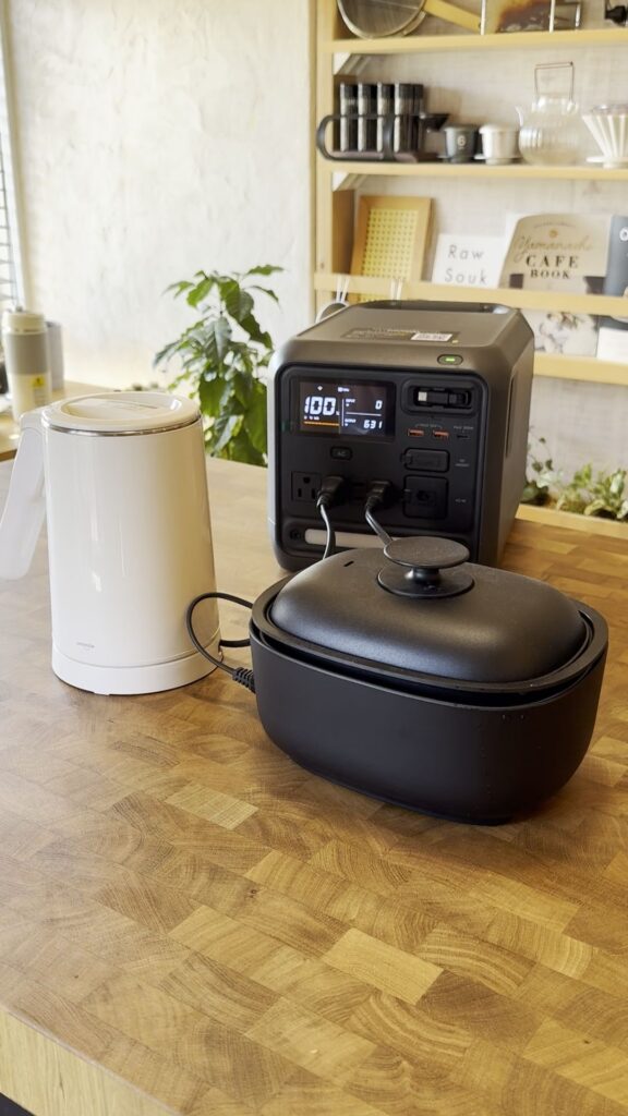 出力800W(一部1200W)と一般的な1000Wh帯で比較すると低い出力ですが、小型家電も充実している為、例えば、小型電気ケトルと小型電気鍋を組み合わせることで、2台同時に調理(お湯を沸かしながら鍋を作る)できる。全ての性能が高い全部盛りの高性能なモデルも多い中、DJI最新機は、とても良い着眼点で、ユーザーニーズを考えて設計されているように感じました。