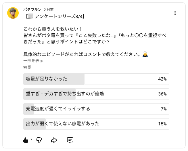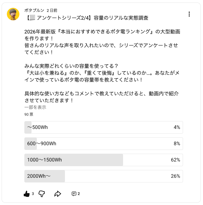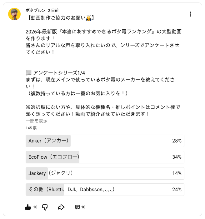 コンテンツ制作にあたり、筆者一人の意見だけでなく、ポタブルンのYouTubeチャンネル4.6万人にアンケートを取り、どのメーカー、どの容量クラス、選ぶ上で重要な機能、失敗談などを集計して、コンテンツ制作に反映中です。