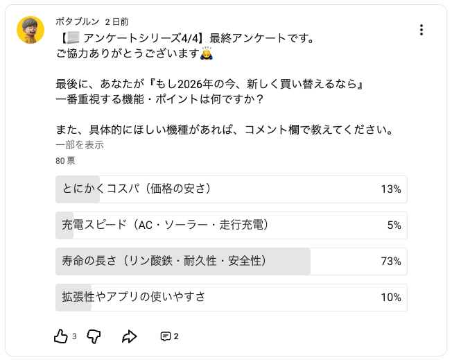 下記、集計中のポータブル電源のアンケートです。